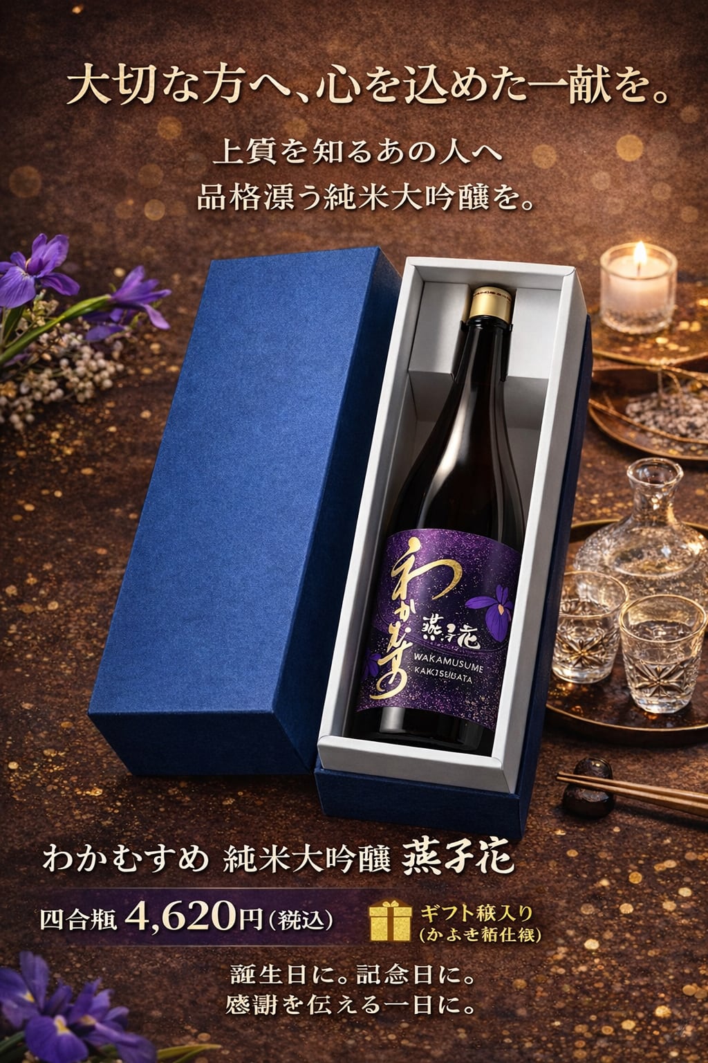 華やかでありながら嫌みのない吟醸香が豊かに広がり、和三盆糖のような、さらりとしてやわらかな甘味が気品を感じさせる純米大吟醸酒